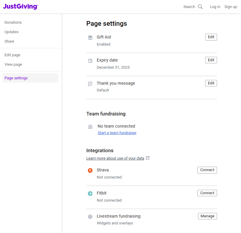 - Head to "Page Settings" on the left side of the screen then scroll down to Integrations and "Livestream fundraising" and "Manage".