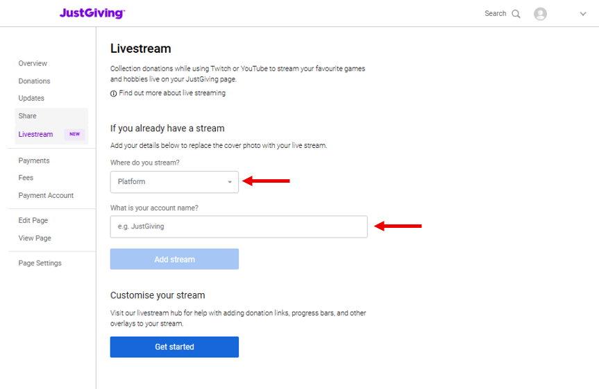 5. Click "Add stream" and "Get started" when you're finished. View your page to check it is working and you are live on screen! If you get an error message after adding your stream you can either refresh your page, or log out and try again.