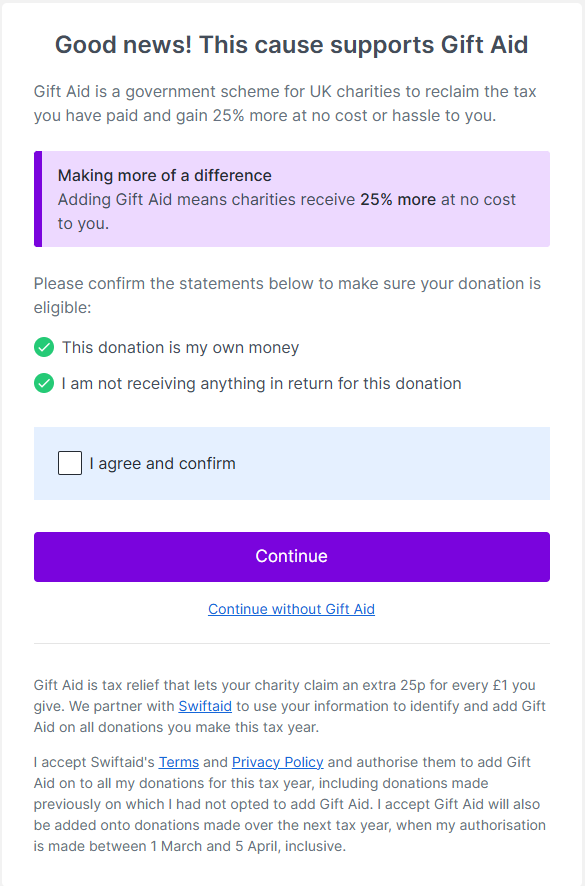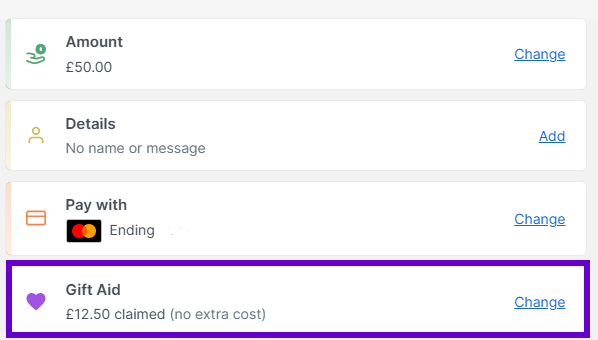 To make things easier in future, your Gift Aid status will be saved for the next time you donate. You can review this status each time you donate before completing the checkout.